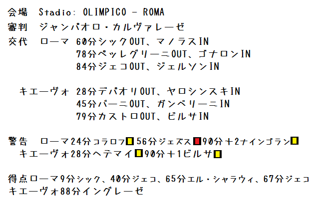 得点シーンは9分、ジェズスのロングボールを左サイドでナインゴランが受け取る。ラドヴァノヴィッチがプレスをかけるもナインゴランは粘ってボールをキープしクロス。このボールにゴール前に走り込んできたシックが左足で合わせローマが先制しました。40分にはジェコが左サイドのコラロフにパス。コラロフのクロスにゴール前に走りこんできたジェコが左足で合わせローマが追加点を奪いました。65分にはハーフウェイライン付近からエル・シャラウィがドリブルを開始し、そのまま一人で敵陣を突破しシュート。ローマが3点目を奪いました。続く67分、ナインゴランのパスをジェコがぺラルティエリア手前右側で受ける。ジェコは少し内側に切れ込んでミドルシュート。これがネットを揺らしローマが4点目を決めました。最後の得点は88分右サイドのコーナーキックから。ビルサが蹴ったボールをゴナロンとの競り合いを制したイングレーゼがヘディングで決めキエーヴォが1点返しました。